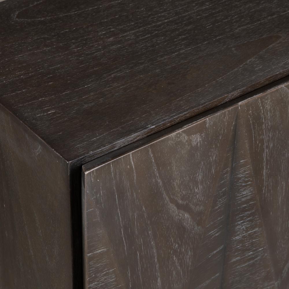 This Cabinet Features Geometric Door Fronts And Is Crafted Of Ebony Cerused Mindi Veneer. The Rich Wood Tones Are Complemented By A Sleek Gold Plated Base, Adding A Contemporary Flair To This Piece.
