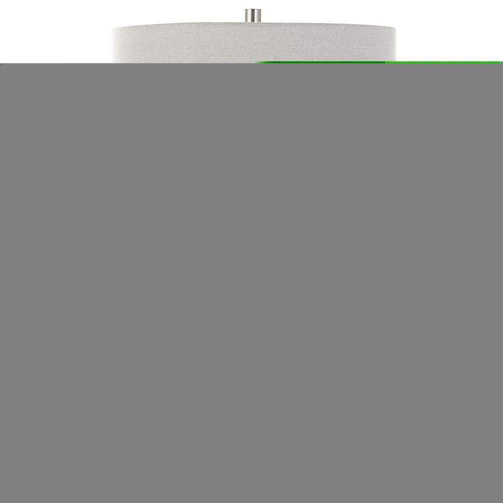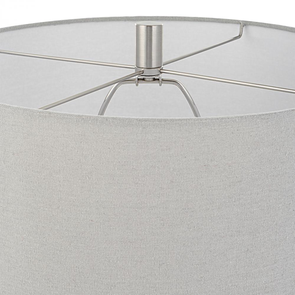 This Ceramic Table Lamp Features A Deep Mushroom Gray Glaze Over Carved Details, Accented with Polished Nickel Plated Details and An Elegant Crystal Foot. The Lamp is Paired with A Hardback Drum Shade in Light Gray.