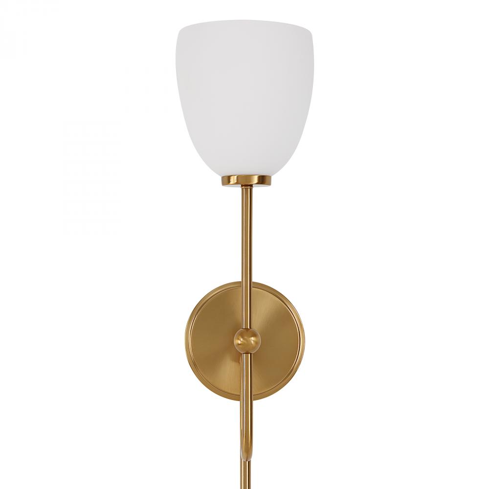 A Classic Urban Sconce in A Warm Brass Finish Enhanced with A Matte Opal Glass Shade. Includes Dual Mount Option with 8' of Wire & Plug, In-line Dimmer Switch, and 3-12" Metal Cord Covers for Easy Plug in Installation or It Can Be Wired Directly to An Outlet Box As A Sconce. 1-60 Watt Max, Edison Socket. Bulb Not Included.