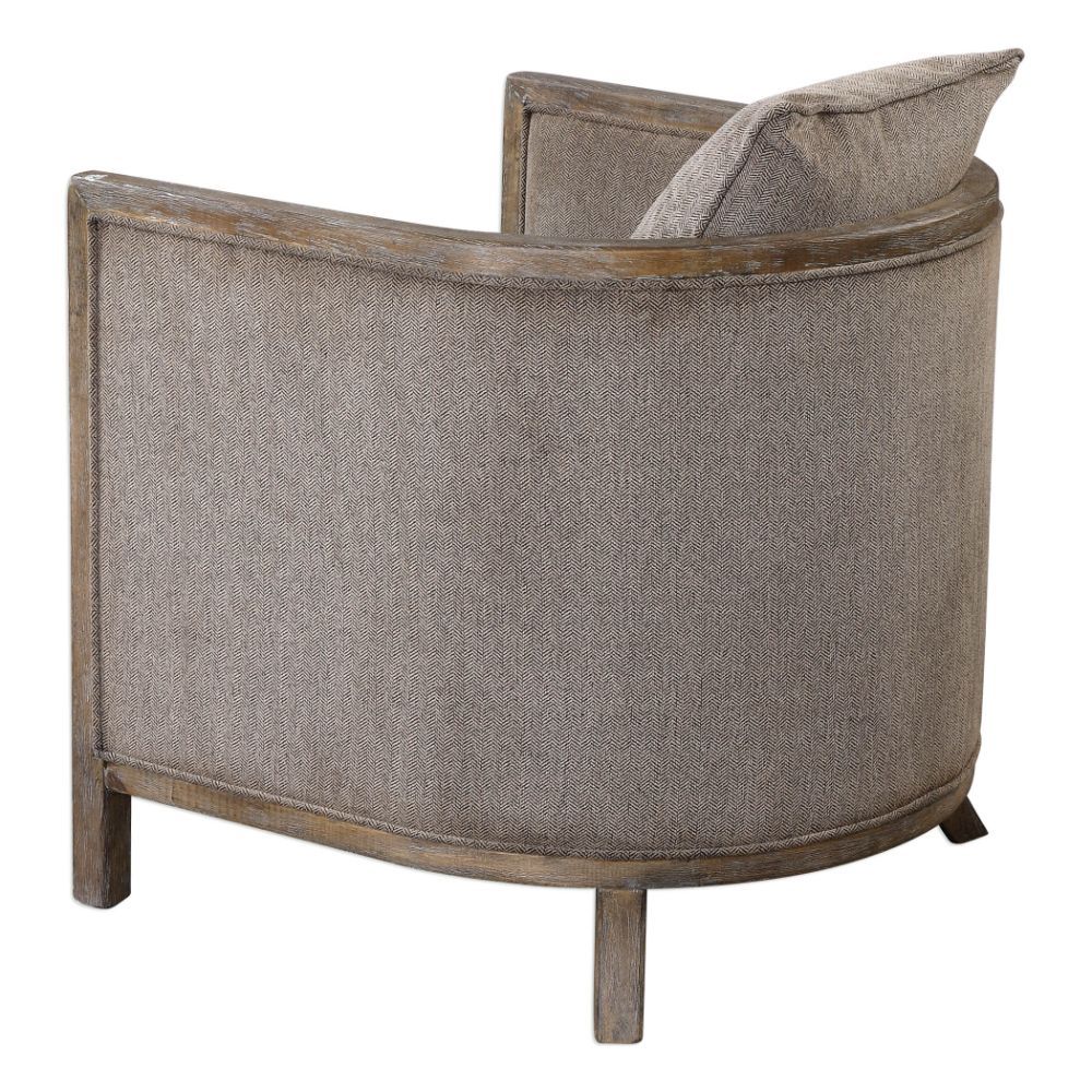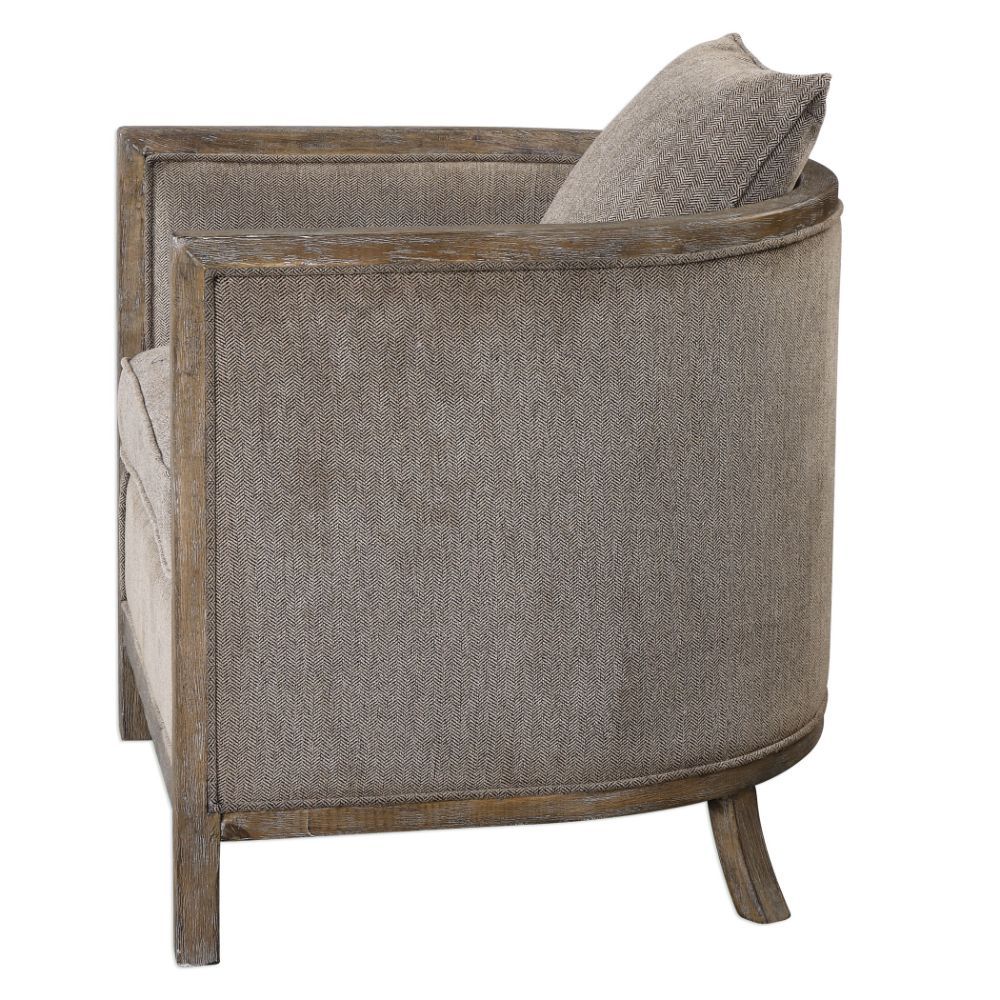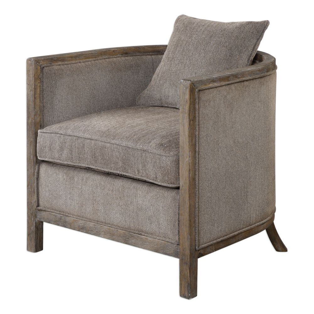 Versatile Tub Chair with A Wonderful 360 Degree View. The Softly Weathered Exposed Hardwood Frame is Lightly Washed in Gray to Blend with The Shimmering Gray Chenille Neutral Flaxen Fabric. Great to Float in Any Space. Seat Height is 18".