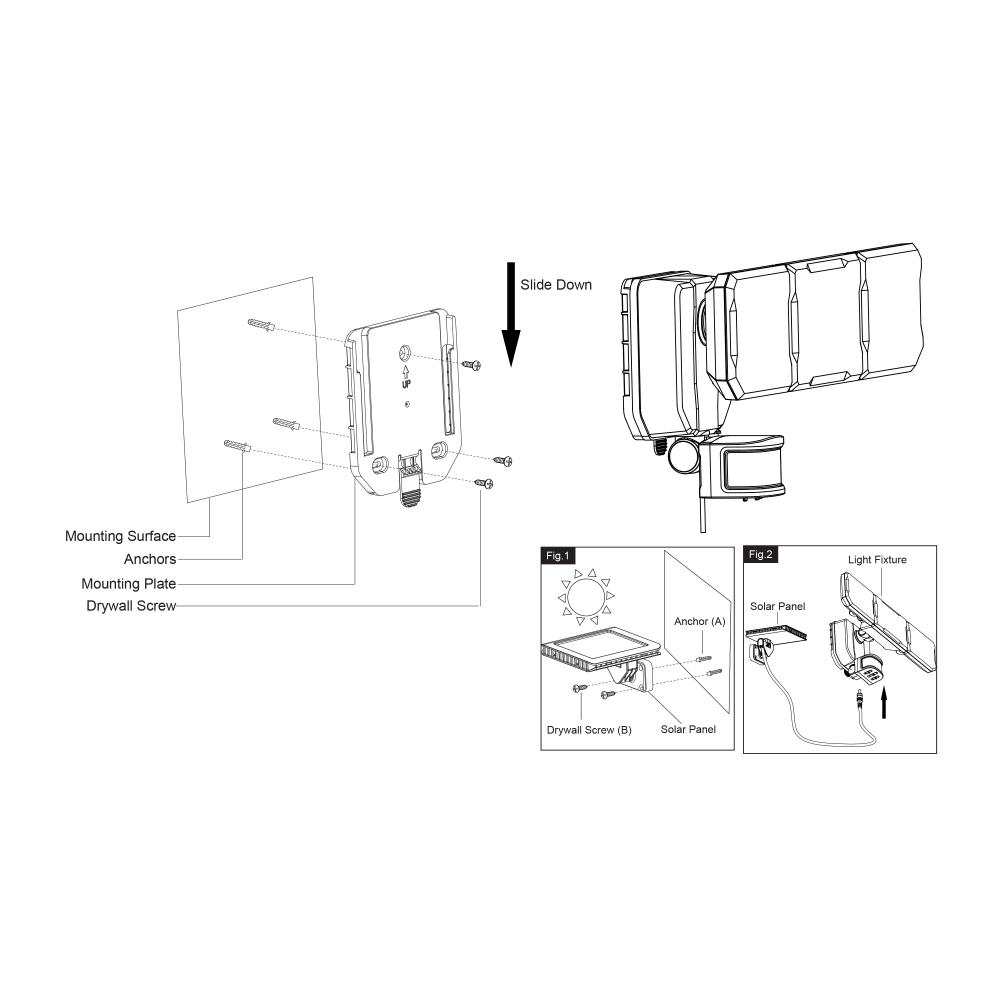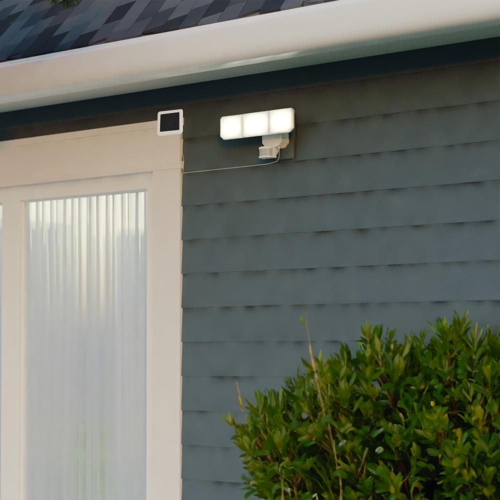 This 3-light integrated LED solar outdoor motion sensor security light provides dual-level lighting: ambient 2700K low-level lighting overnight and 5000K full brightness high level when motion is detected. The light heads and sensor are fully adjustable and automatically deliver 2500 lumens to illuminate your home’s exterior with warm ambient light at dusk, then instantly brighten when motion is detected. The included solar panel is equipped with a 16 foot connecting wire to allow for positioning in maximum sunlight for solar power or optional battery backup power with 3 x 1.5V C-Type Alkaline batteries (not included) keeps your lights powered no matter the weather. Customize your lighting options with 2 modes of operation plus adjustable motion sensor sensitivity. Suitable for wall or eave mounting with a wide 240 degree detection area and up to 50 feet. This Dualux security flood light expands the functionality, safety, and security of your home’s outdoor spaces with bright, reliable light when and where it’s needed.