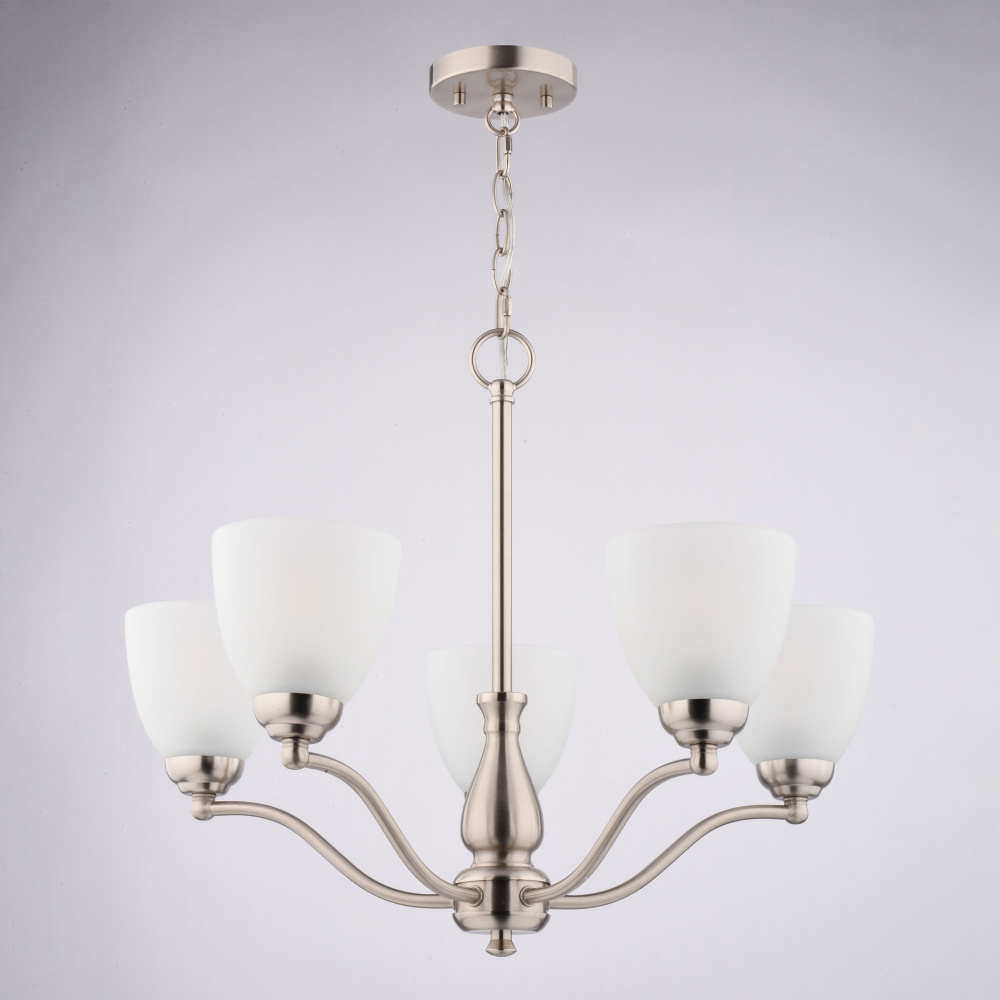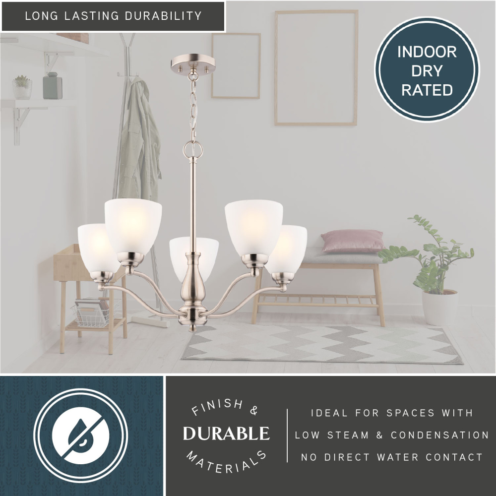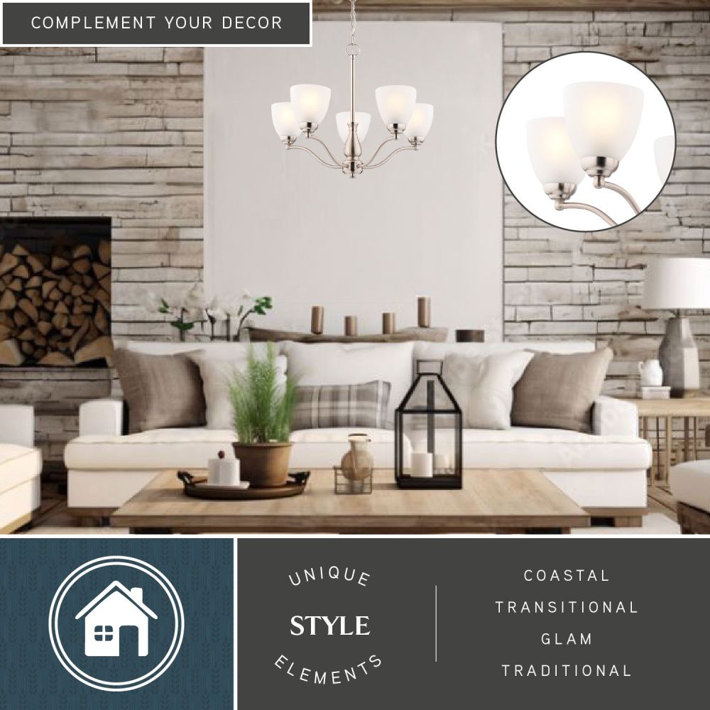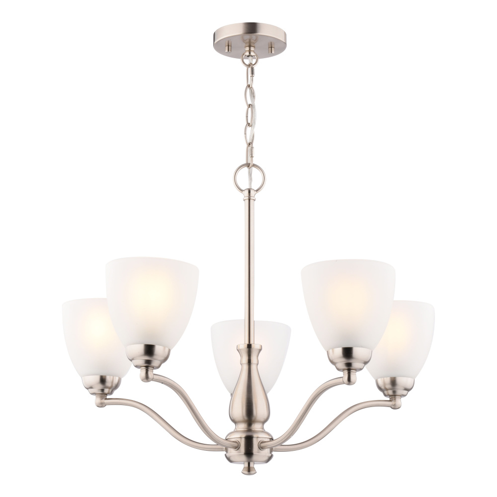 Create a warm and inviting ambiance in your home with the Ballwood 24.5-inch 5-light chandelier. This beautifully designed fixture features graceful curves and soft, frosted glass shades that create a warm and inviting ambiance. The satin nickel finish complements any color scheme, while the white frosted glass adds a touch of vintage charm. Enhance your dining room, create a welcoming atmosphere in your entryway, or add a touch of sophistication to your living room with this elegant chandelier.