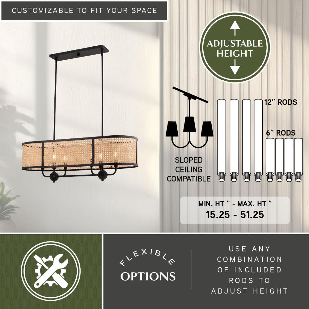 The Berens interior lighting collection speaks loudly to modern farmhouse and coastal charm. The woven linear rattan shade combined with a matte black finish provides style and lighting to your indoor areas. Pendant height is adjustable with the included downrods; compatible with vaulted ceilings. This natural cane linear chandelier would be a stunning addition to any kitchen or dining area.