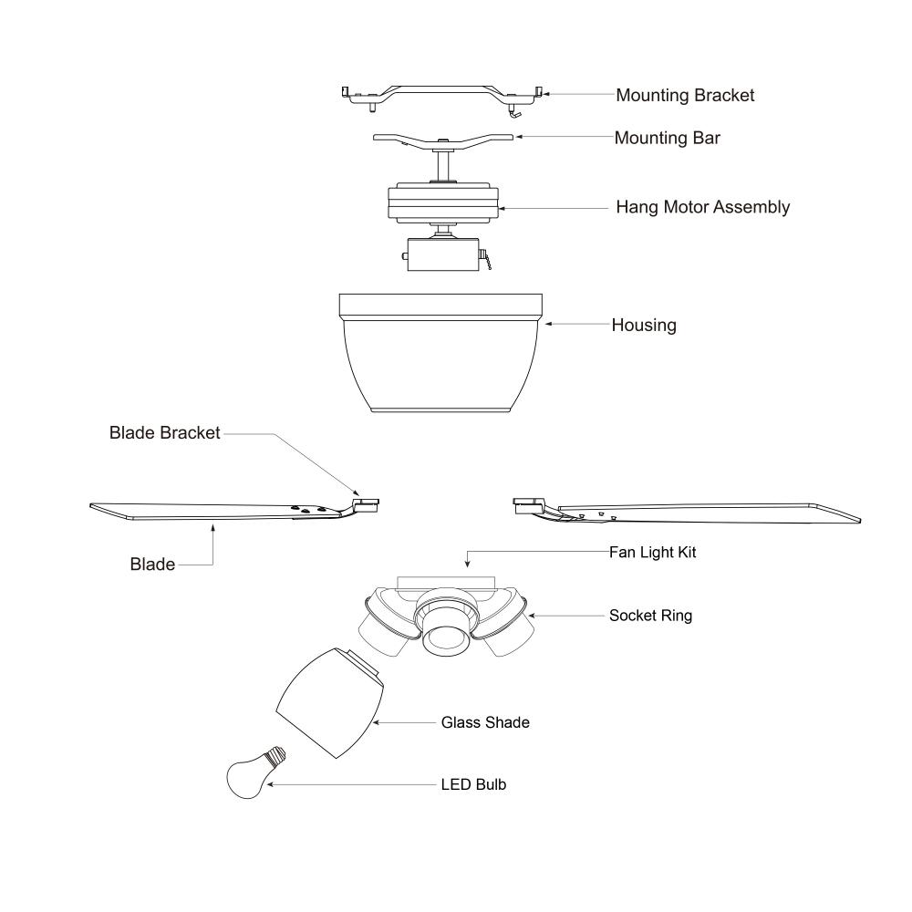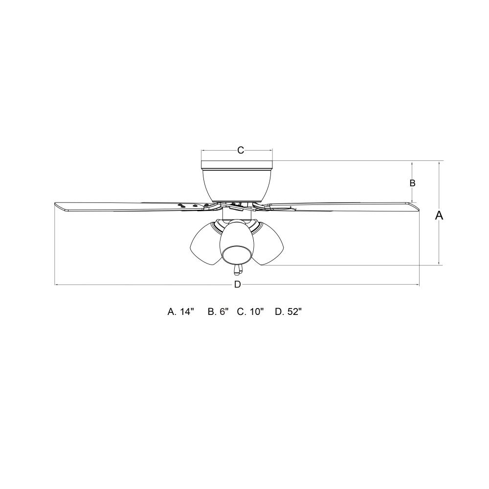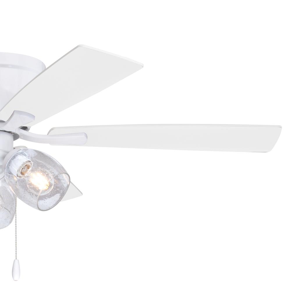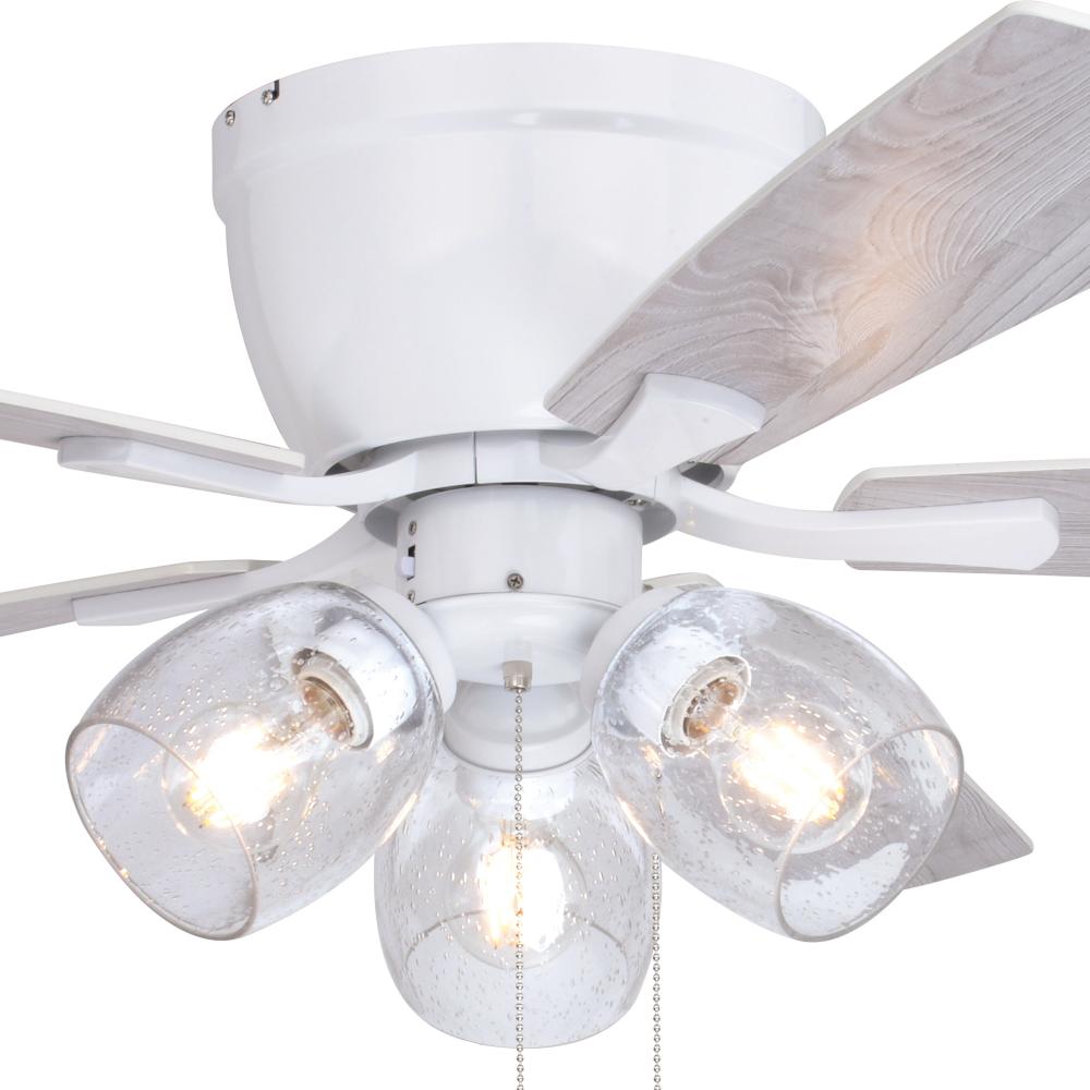 The Brayton ceiling fan in a white finish is transitional styling with a modern look and good value price. The light kit features three distinct clear seeded glass shades and includes clear LED bulbs. Attractive reversible white or gray elm blades allow you to coordinate with any decor. A pull chain makes it easy to control the three speeds. The flush mount motor housing is ideal for low ceilings and standard height rooms. This fan is perfect for your living room, bedroom, kitchen, or home office. Can be alternatively installed without the light kit.