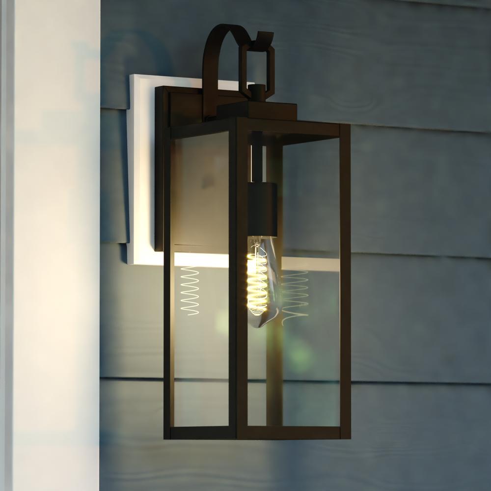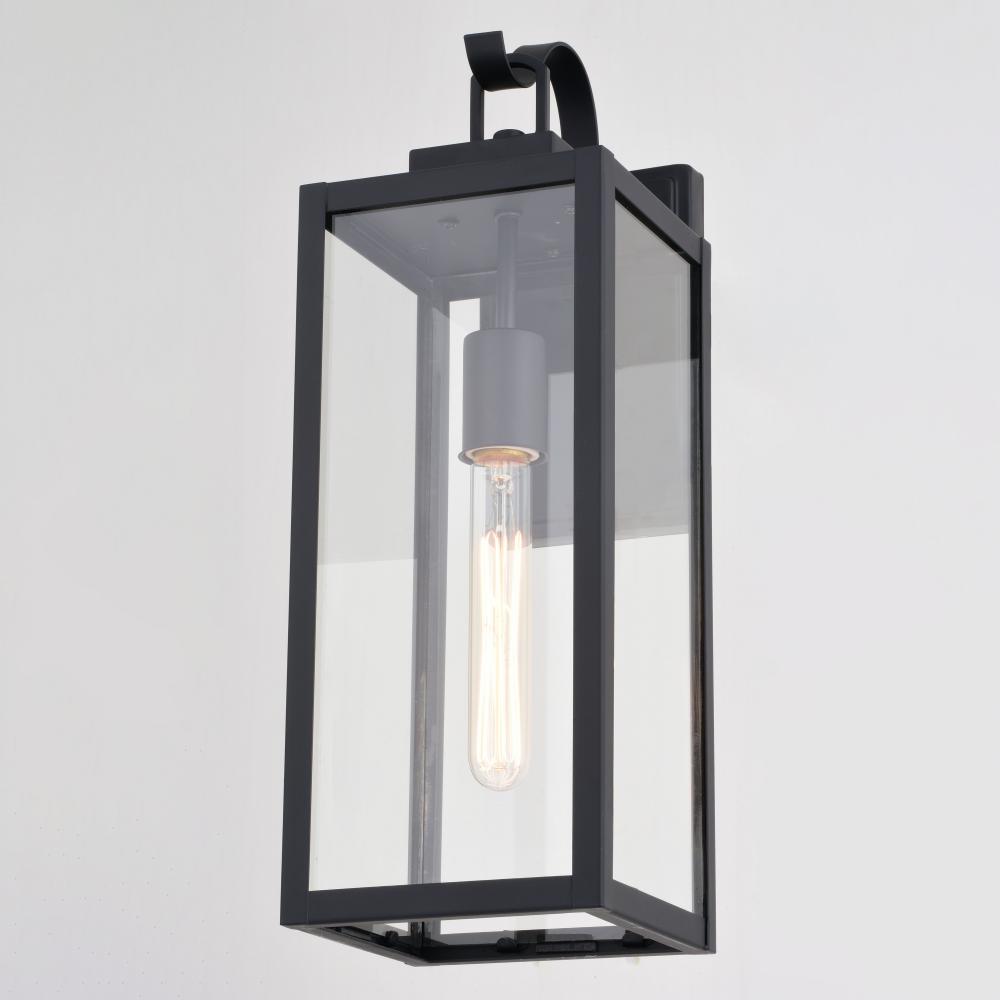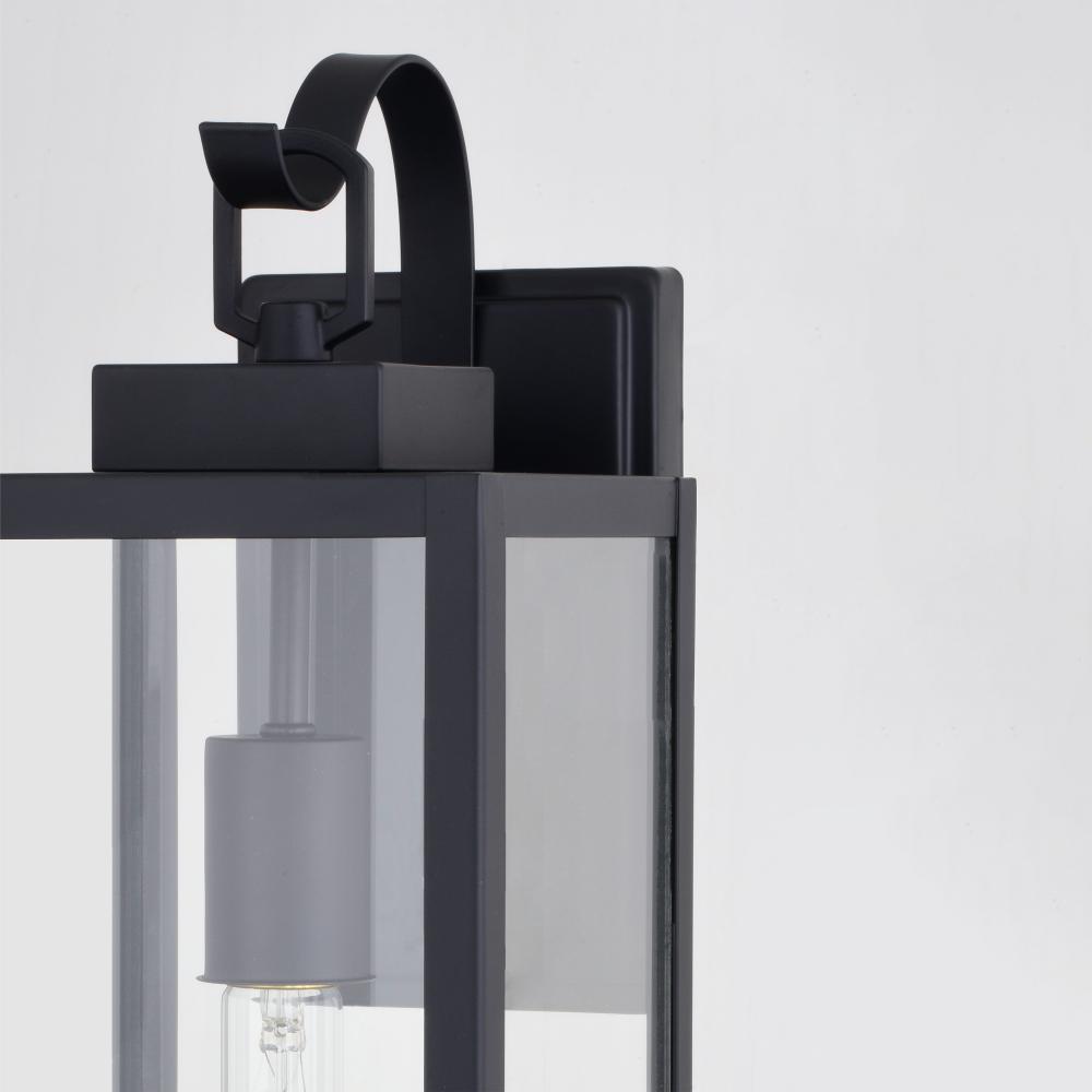 Elongated and slim, the Clinton collection is both simple and elegant. The wall light is made up of clear glass, encased in a weather resistant matte black metal frame at a key price point. The lantern's top curved handle accents the geometric frame for a unique look. When lit, a warm inviting glow illuminates through the clear glass, making it a perfect piece for both indoor and outdoor settings. The overall monochrome theme of the fixture adds a sense of minimalistic elegance to any transitional or contemporary decor.