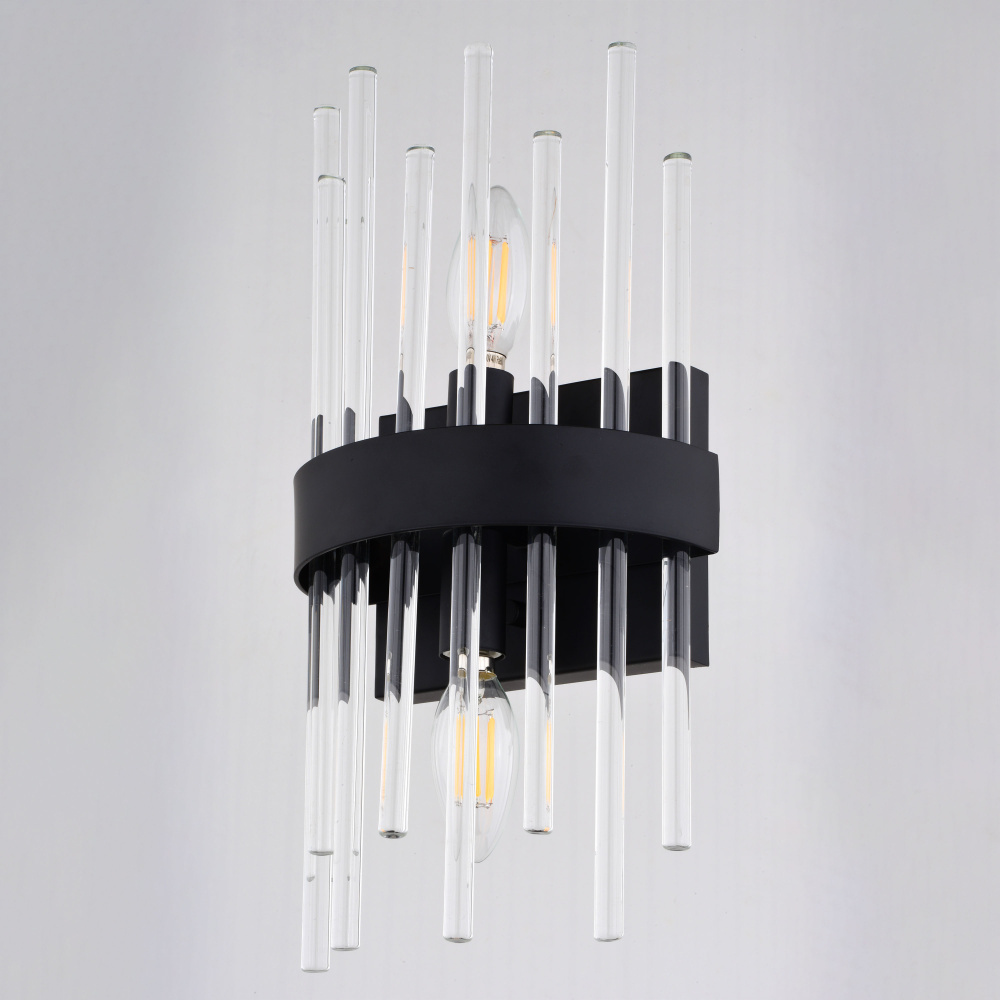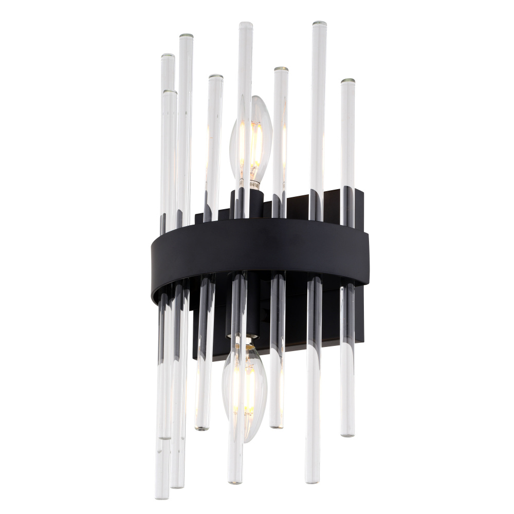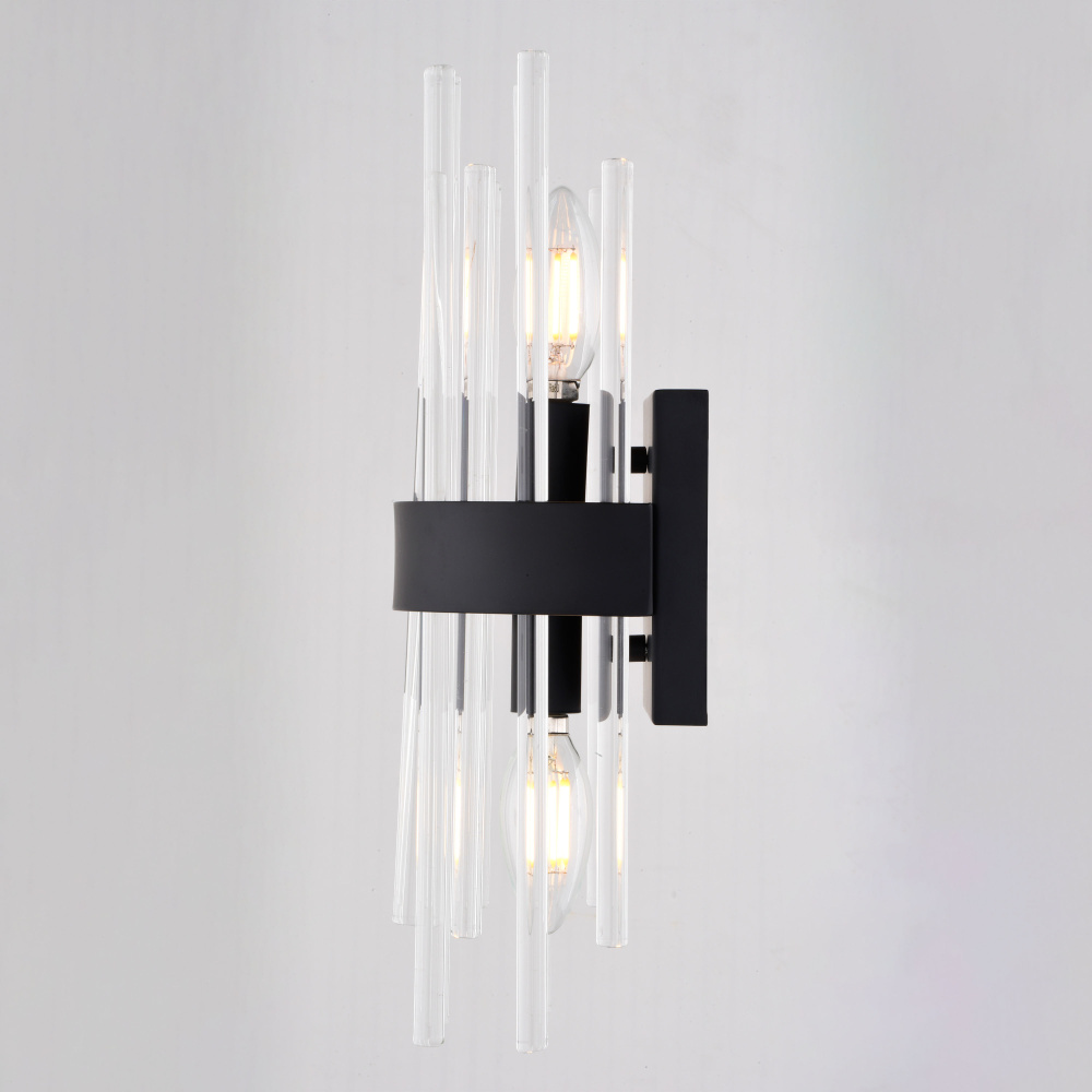 Embrace the sophisticated glamour of Art Deco design with the Delevan 14-inch wall light. This stunning fixture features sleek crystal rods set against a modern matte black finish, creating a luxurious focal point for any space. The popular crystal rod trend gets an updated twist with the Delevan's clean lines and elegant silhouette. Perfect for bathrooms, hallways, or dining rooms, this fixture adds a touch of timeless style to both contemporary and transitional interiors.