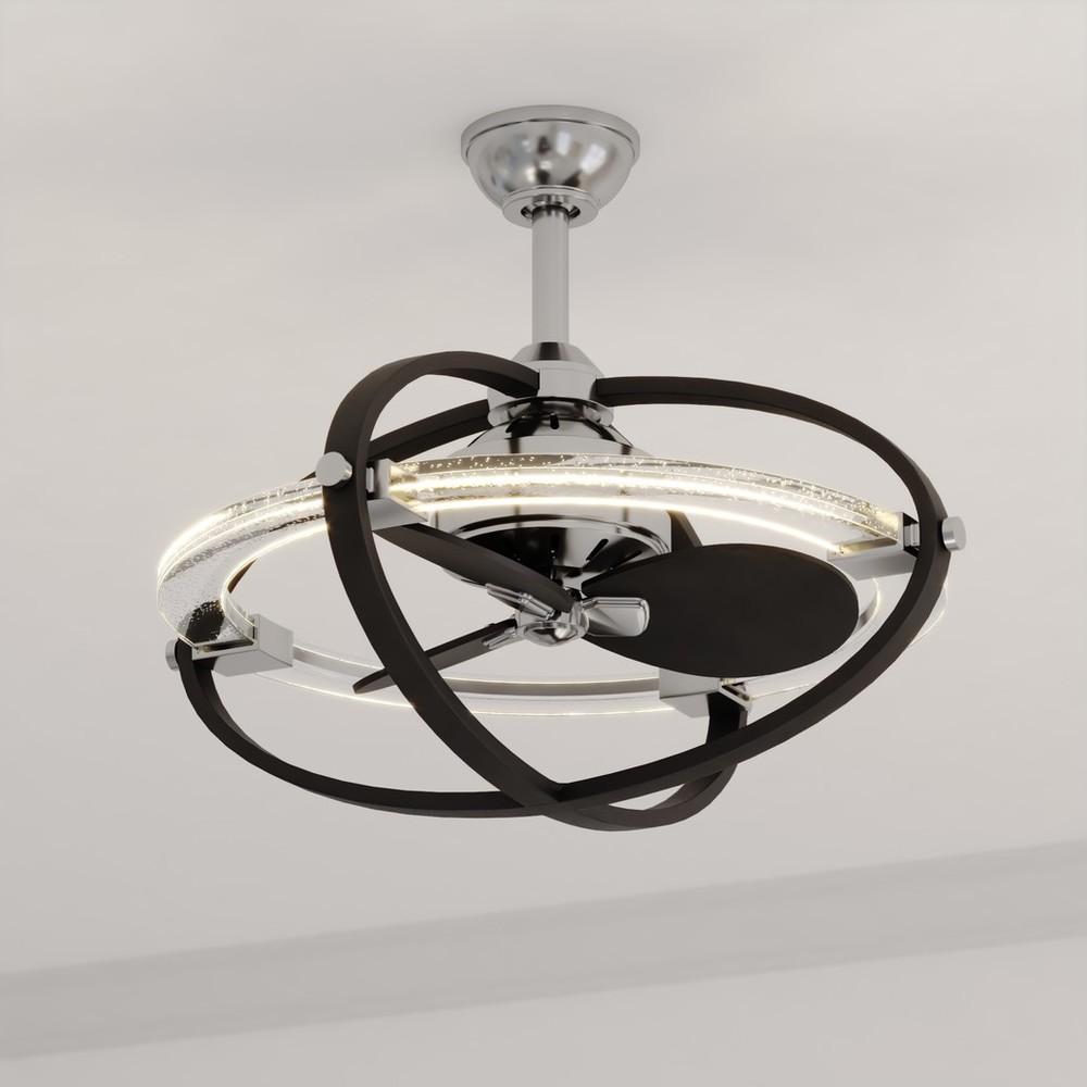 Bands of suspended traveling ellipses float around the Galileo ceiling fan. A satin nickel and black finish combined with an illuminated clear bubble LED ring give this fan an out of this world appeal. An integrated LED light source provides energy saving, no bulb changing convenience, low maintenance and long-lasting performance. Remote control included, height adjustable with longer downrod (sold separately), sloped ceiling compatible. Ideal for smaller spaces including family rooms, bedrooms, or any other contemporary area of your home.