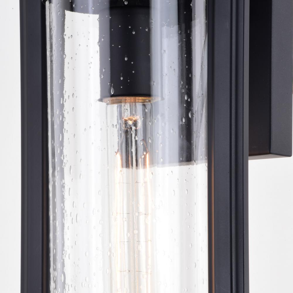 The Malmo collection makes for a dramatic statement with its minimalistic and contemporary style. The matte black metal rectangular detail frames a clear seeded glass cylinder for maximum impact. This outdoor wall light is ideal for your porch, entryway, garage, or any other outdoor area of your home. Equally suited for indoor use such as the bath, hallway, or kitchen spaces.
