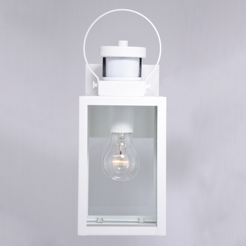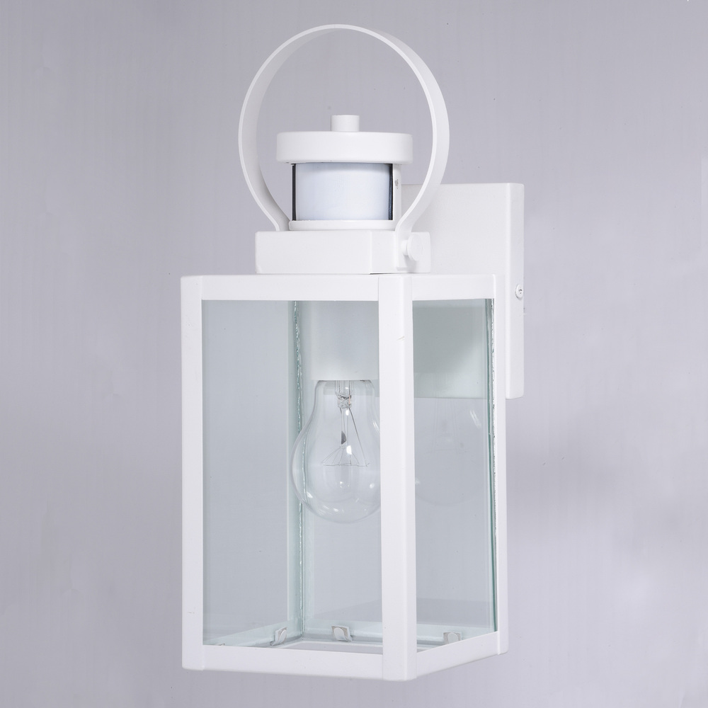 The Medinah is an example of classic minimalist elegance. Large panes of clear glass are framed by textured white frames. The top looped lantern handle adds an additional focal point to the overall design. This outdoor wall light is ideal for your covered porch, entryway, garage, or any other area of your home. This fixture combines a motion sensor, dusk to dawn photocell, and timer all in one decorative light. Our easy access quick-set control puts all these features at your fingertips. Enjoy bright illumination (0-6 hours) during the early evening hours with automatic, energy saving dimming until dawn. Whenever motion is detected, bright light keep your property safe and secure. It works with any dimmable incandescent or halogen bulb and many dimmable LED bulbs. This outdoor security light is designed to enhance the beauty, safety, and efficiency of your home.