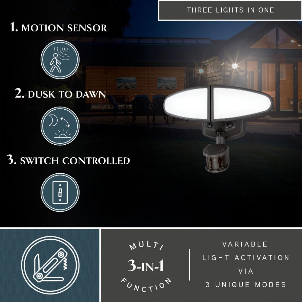 The 2-light Palatine LED motion sensor security flood light provides adjustable low level brightness and color temperature while also delivering brilliant 5000K high level illumination when motion is detected. The modern light heads are fully adjustable and deliver 2700 lumens to keep your home's exterior brighter at dusk, dimmer at night, and instantly bright when motion is detected. Integrated battery back-up feature plus eave or wall mount compatible. This dualux security light expands the functionality, safety, and security of your home's outdoor spaces with bright, reliable light when and where it is needed.